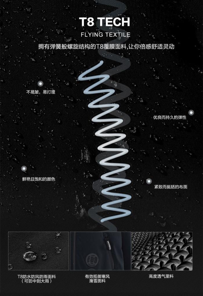 布料材质也超乎我预期地选择了拥有弹簧般螺旋结构的T8面料,这是一款同时拥有涤纶、锦纶、氨纶优点于一身又摈除了其局限性的一款纤维面料。其特有的双组份的结构让它拥有像8字形的横截面,纤维整体如充分卷曲的弹簧一般,这个材质拥有优良而持久的弹性。 因此让这件羽绒服手感也非常干爽、舒适、很好打理,就算折叠也能快速恢复挺括。