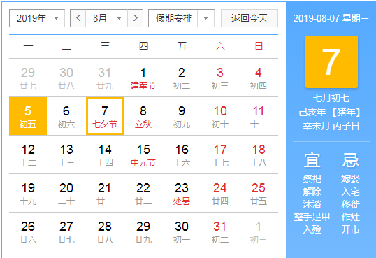 2019年农历七月初七是几月几号:2019年08月07日 星期三