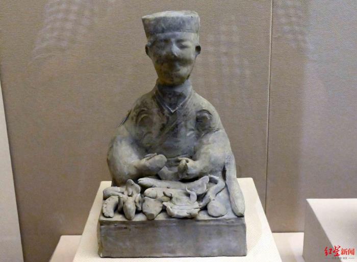 这件庖厨俑是国家一级文物,可以看到这位厨师左手扶压鱼上,右手作剖鱼状,神情专注。仔细观察他面前案板上的食材,可以说是非常丰富了:从右往左,依次有鱼、乌龟、猪头、羊头和鸭子,羊头旁边是一个饺子的形象,外观与现在的饺子如出一辙。经资料查证,这个案板上的饺子应是我国发现的最早的饺子的雏形,所以被称为“天下第一饺”。