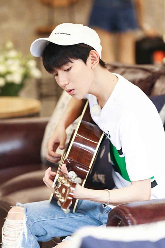 王源在《青春旅社》练习吉他