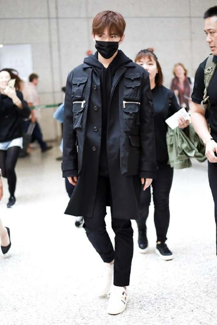 图中王源在机场,只见王源身穿毛衣,运动鞋,透过帽子露出来的眼睛可看出这是一个帅小伙,后面有一位大姐姐粉丝跑着拍照(一脸娇羞状),而王源右边则是一位保镖。