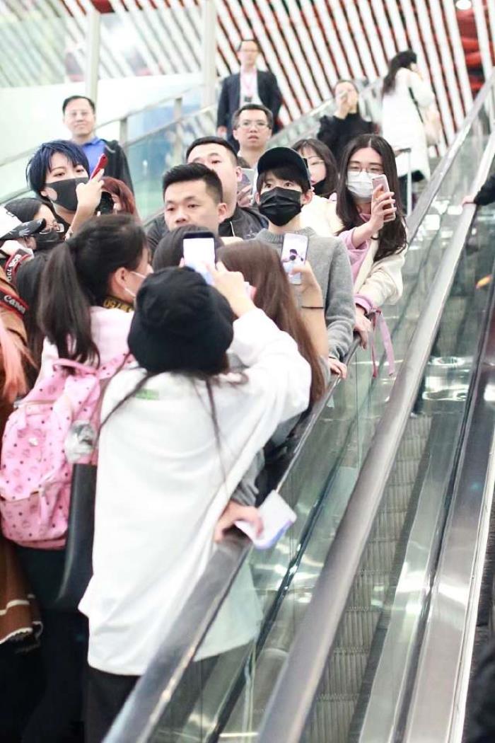 图中王源在机场电梯下楼,王源一脸淡定的扶着电梯,前后都有美女姐姐举起手机拍照,后方走另一个电梯的大叔都看呆了。可能在想,这个孩子是谁啊。