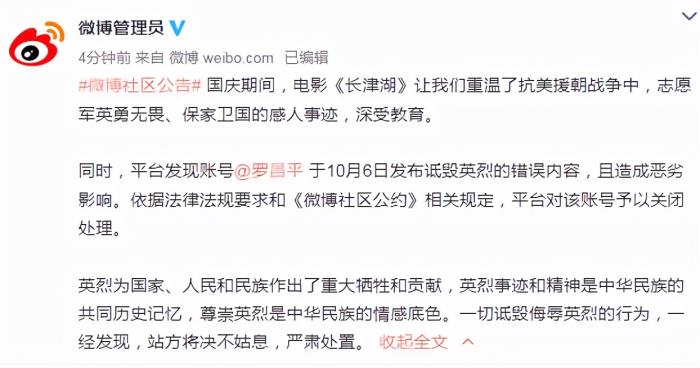 同时,平台发现账号@罗昌平 于10月6日发布诋毁英烈的错误内容,且造成恶劣影响。依据法律法规要求和《微博社区公约》相关规定,平台对该账号予以关闭处理。