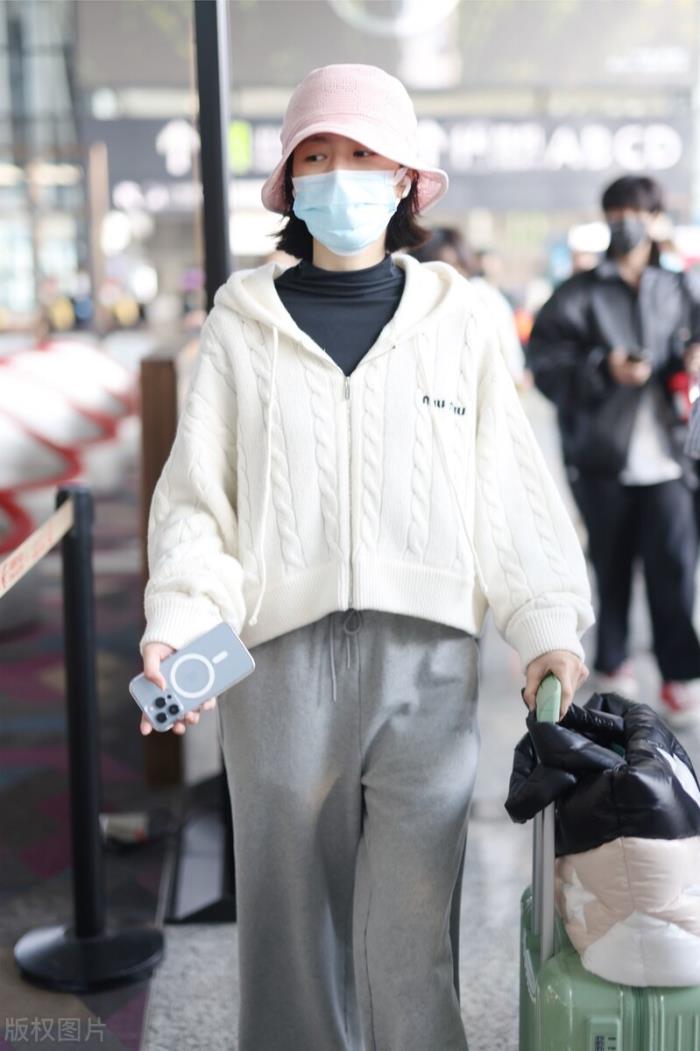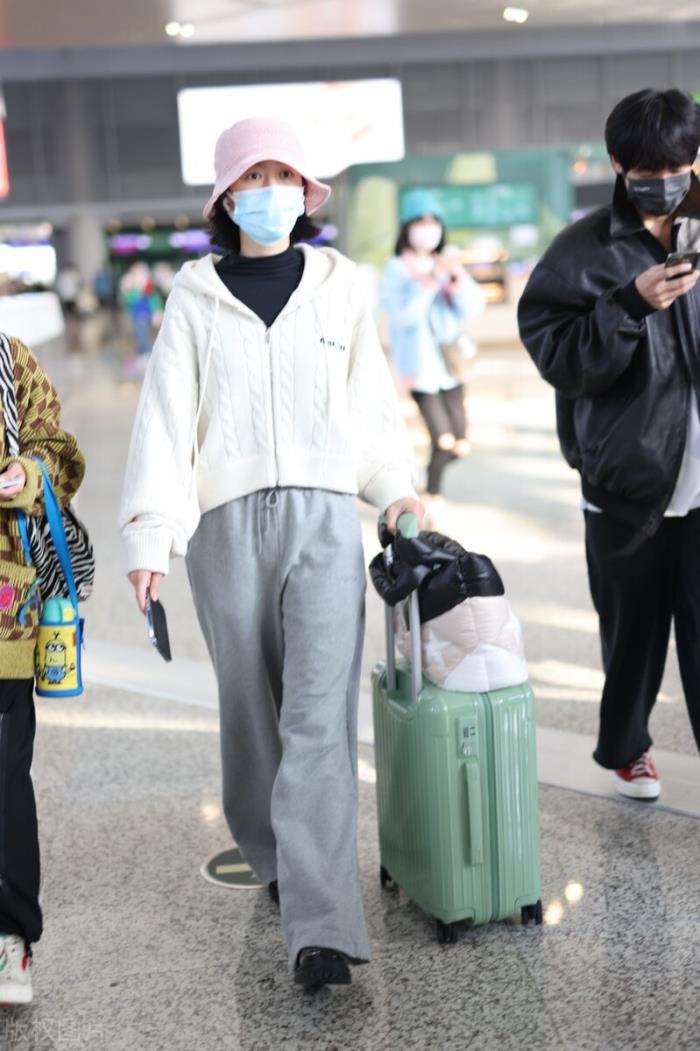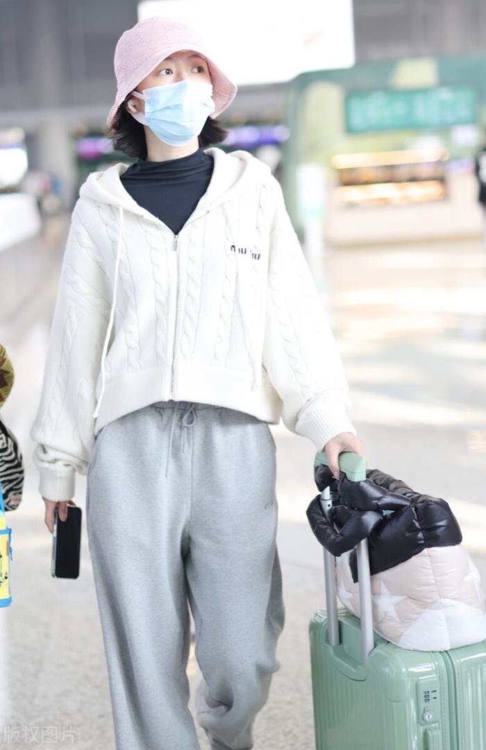 2021年10月23日,周雨彤现身机场,她穿白色针织衫搭配灰色休闲裤,戴粉色渔夫帽休闲舒适。