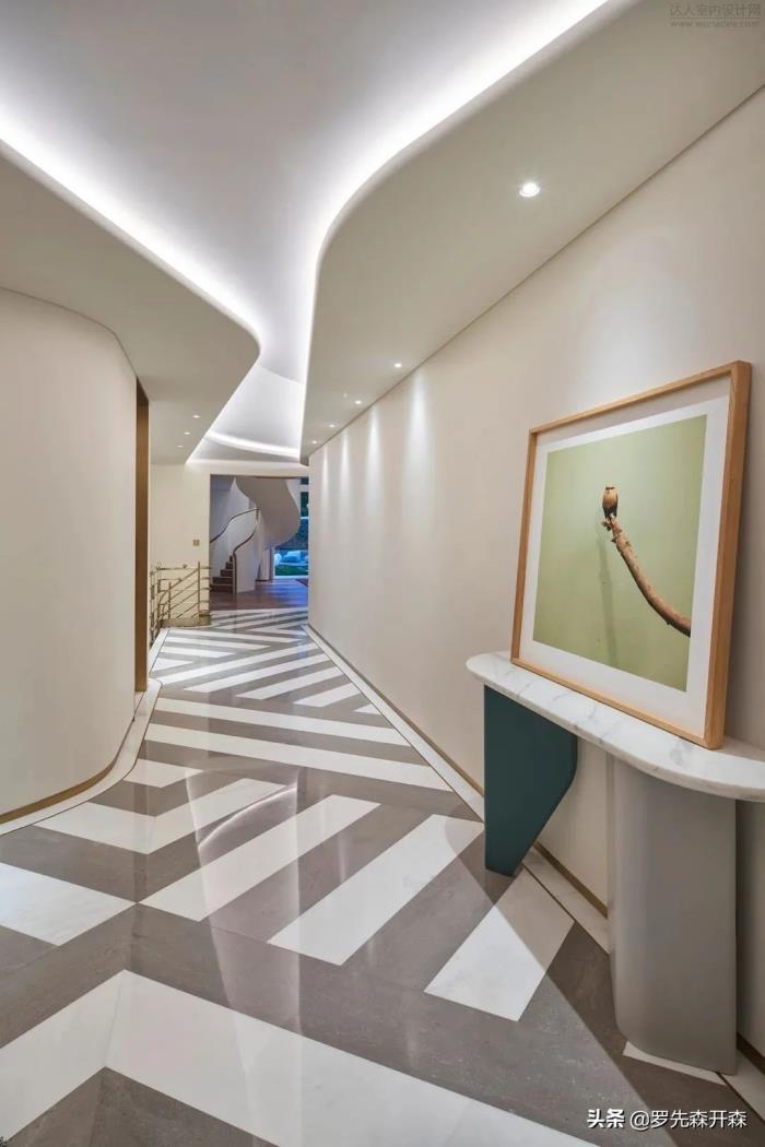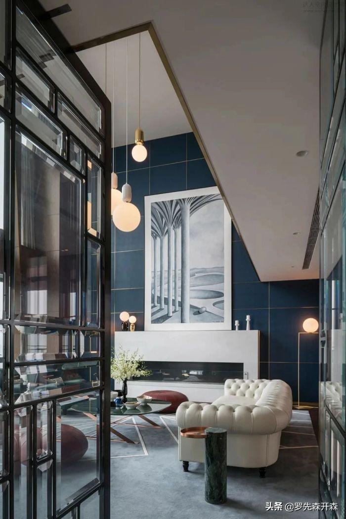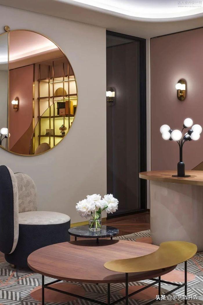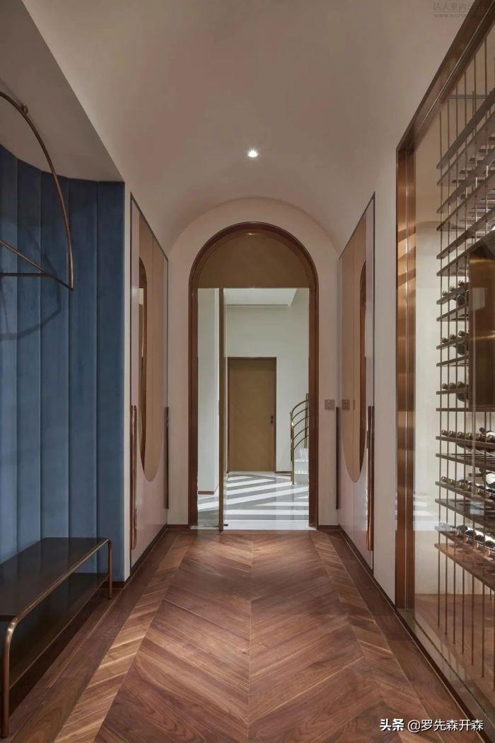 走到地下室,娱乐区被打造成一个独立而分隔的空间:天鹅绒材质的应用,用古铜色取代香槟金,象征舞台帷幕的形状与色彩,皆营造出一个颇为剧院化的氛围。