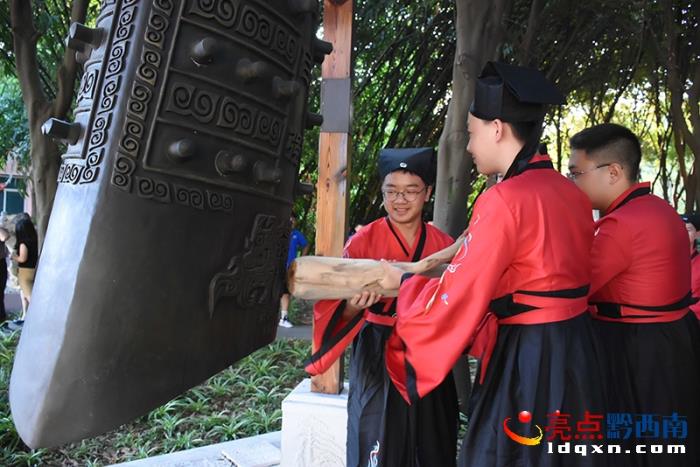 活动尾声,全体师生向文化墙上的先贤们行拜师礼,庄严虔诚,诚挚恭谨;学生撞响自强音乐编钟,钟声悠扬,荡涤心房。