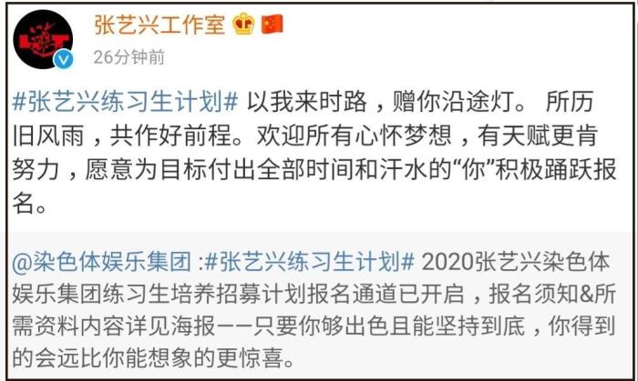 随后张艺兴便宣布成立了自己的公司并且输出了一些看似有些虚无缥缈的概念,日前他更是落实了这些起初令人看不懂的畅想,张艺兴正式宣布将会启动全球练习生招募计划。