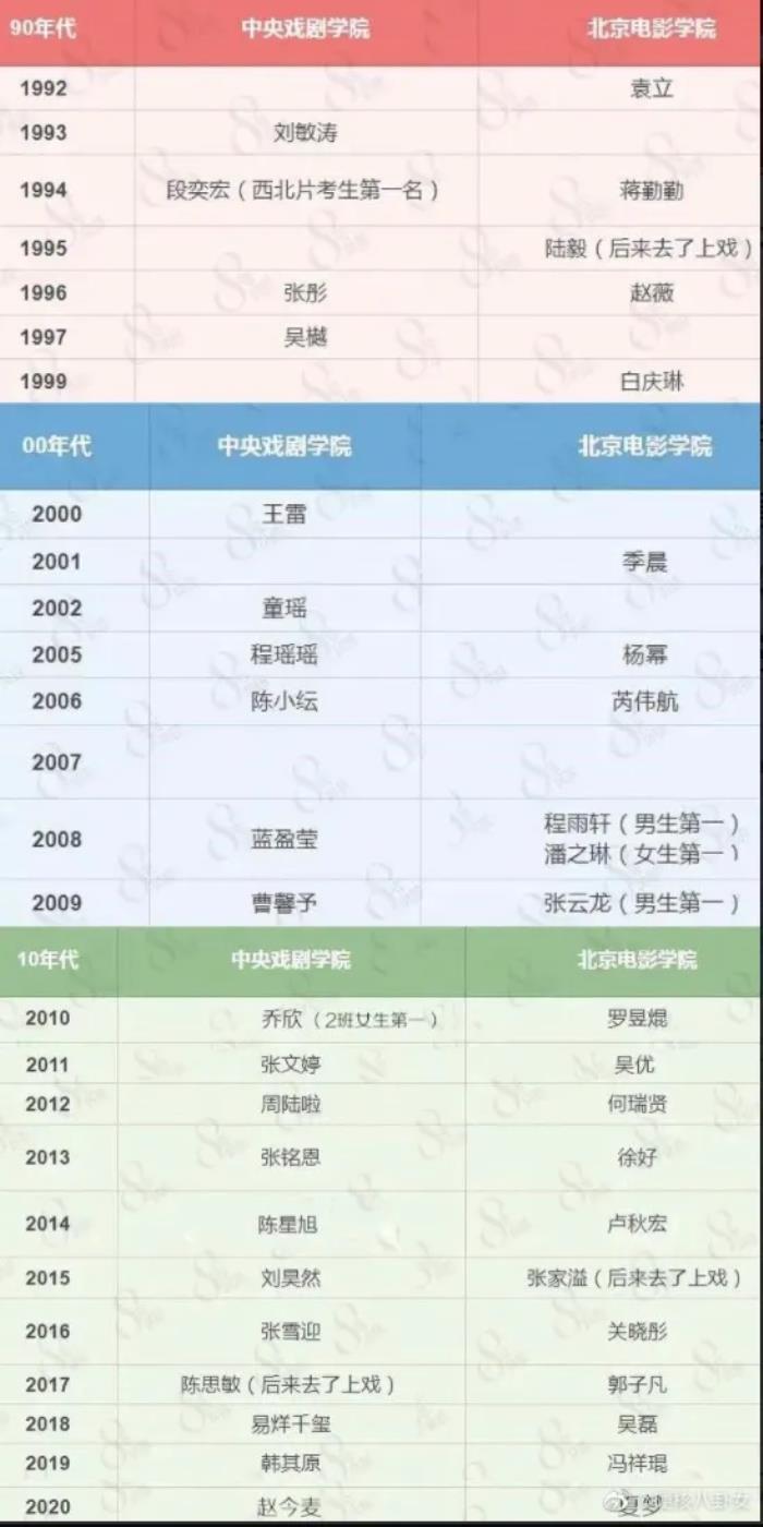 吃瓜的同时,坛子还搜罗到一份表格——近30年来,中戏北电两大院校的表演专业第一名名单。