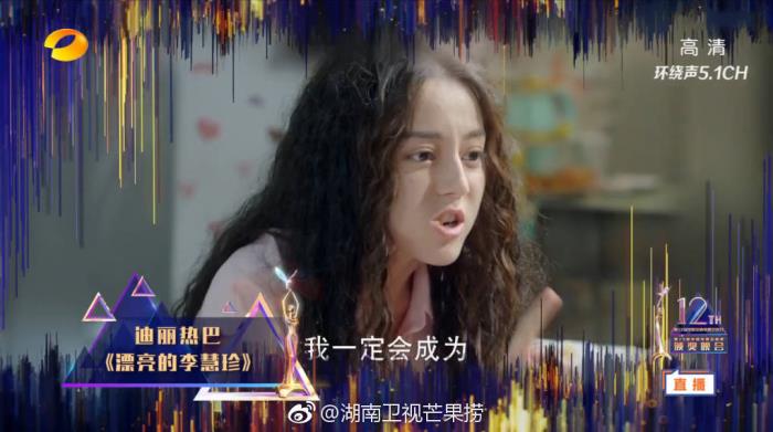 迪丽热巴上台领奖发表获奖感言:谢谢我的颁奖老师,谢谢金鹰节给我这个奖项,非常感谢大家喜爱《漂亮的李慧珍》,感谢所有的评委对我的鼓励,这个奖项提醒我做一个好演员。