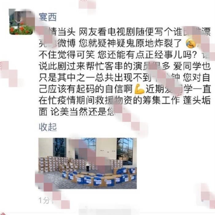 张天爱的公司发声明以及张天爱本人在微博中回应似乎还不够,张天爱的老板也忍不住在朋友为张天爱说话,她的老板直接在朋友圈回怼:近期爱同学一直在忙疫情期间救援物资的筹集工作,蓬头垢面,论美当然还是您家。