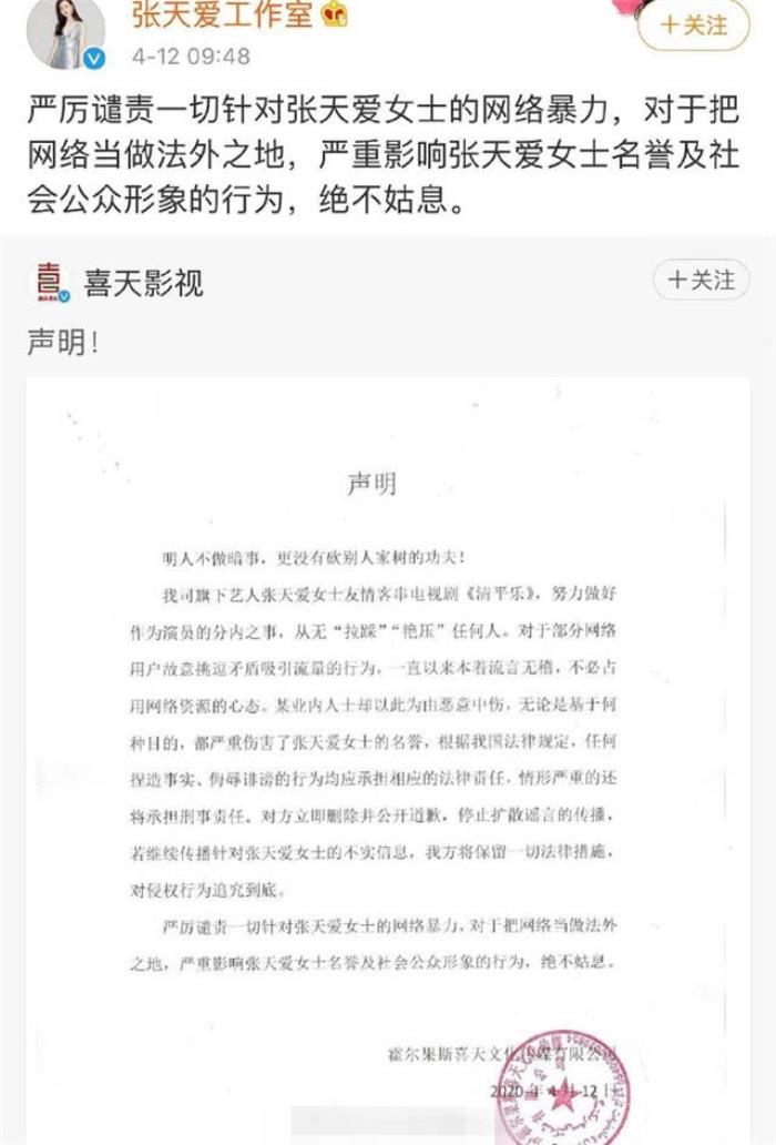 对此,张天爱的工作室也直接发出了声明回应江疏影经纪公司“砍树”的说法。张天爱工作室称张天爱这一次是友情客串,但是网络中的“拉踩”、“艳压”行为都是无稽之谈,还直指江疏影经纪公司的朋友圈是恶意中伤。这份声明也直接警告了江疏影经纪人删除不良言论并公开道歉。