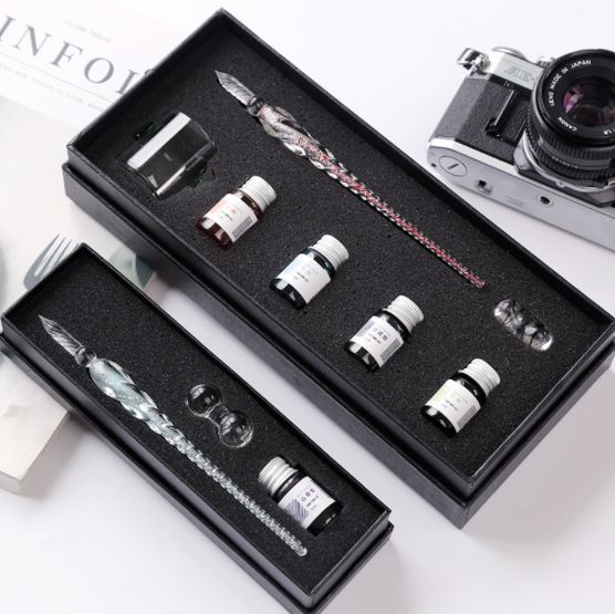套装内含有一支水晶玻璃笔、一个笔架、一瓶墨水,笔尖上具有螺旋纹路,写字时先将笔尖蘸入墨水,这样墨水就会被充入螺旋纹路中,书写时又会顺着笔尖慢慢在纸上留下痕迹,蘸一次墨大约可书写40~60字。