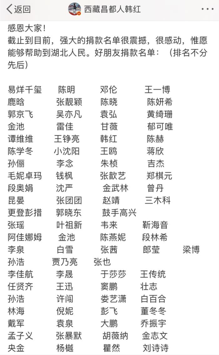 而最近半个多月,大家都在关注着疫情的发展,不少明星也纷纷为武汉捐款贡献出自己的一份力量。在韩红的带领下,善款已经达到了2.78亿,从韩红公布的名单中,我们可以看到很多熟悉的名字,比如易烊千玺、王一博、鹿晗等等。
