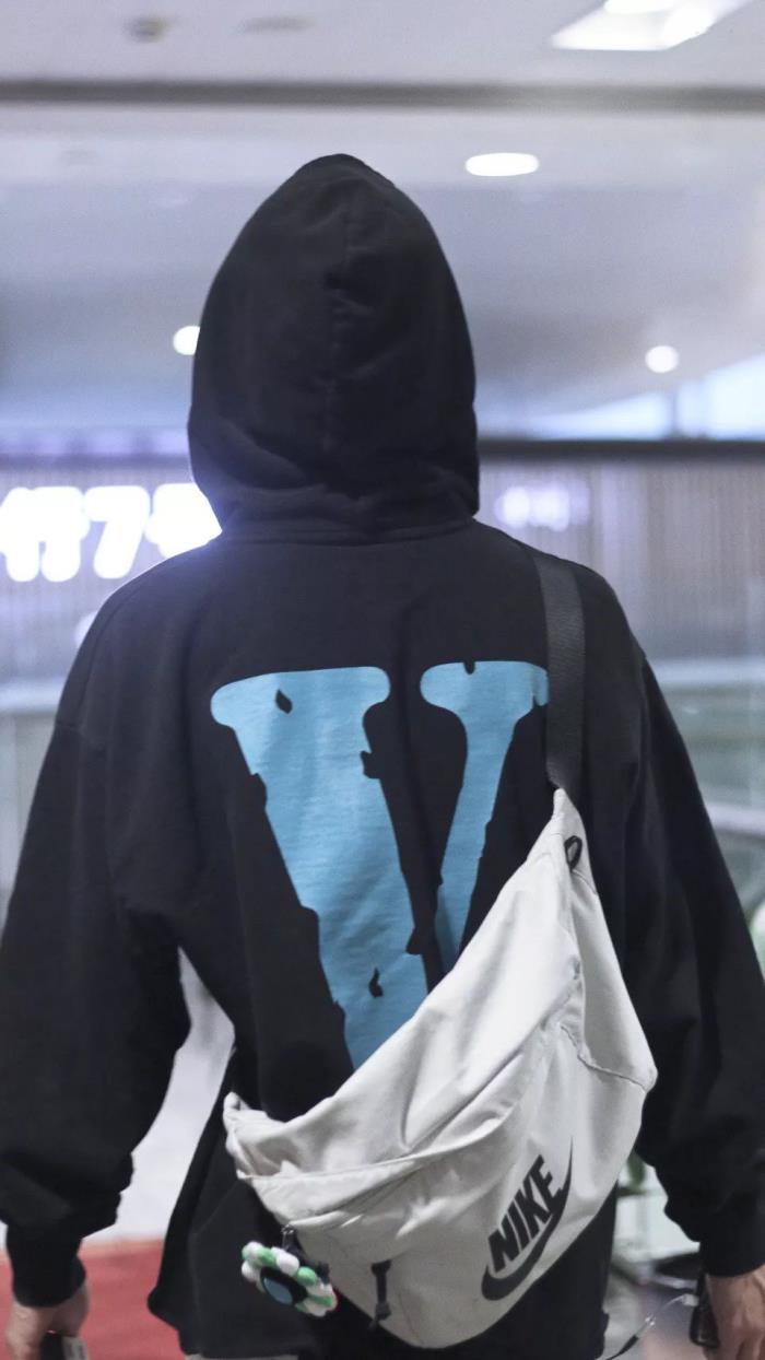 除了 Palace ,王一博的另一个爱就是 VLONE 了。VLONE 卫衣,搭配 99%IS- 的帽子和黑口罩。当然,无论什么 Look , “脏脏包”是一定不能少的。