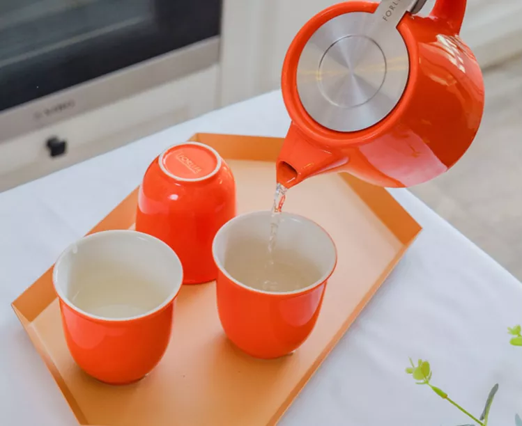除了茶壶和茶杯,里面还有产自武夷山的猴牌大红袍。送新人橙色茶具,不仅视觉上给人活泼明朗之感,也可以表达:心想事橙(成)的美好祝愿。