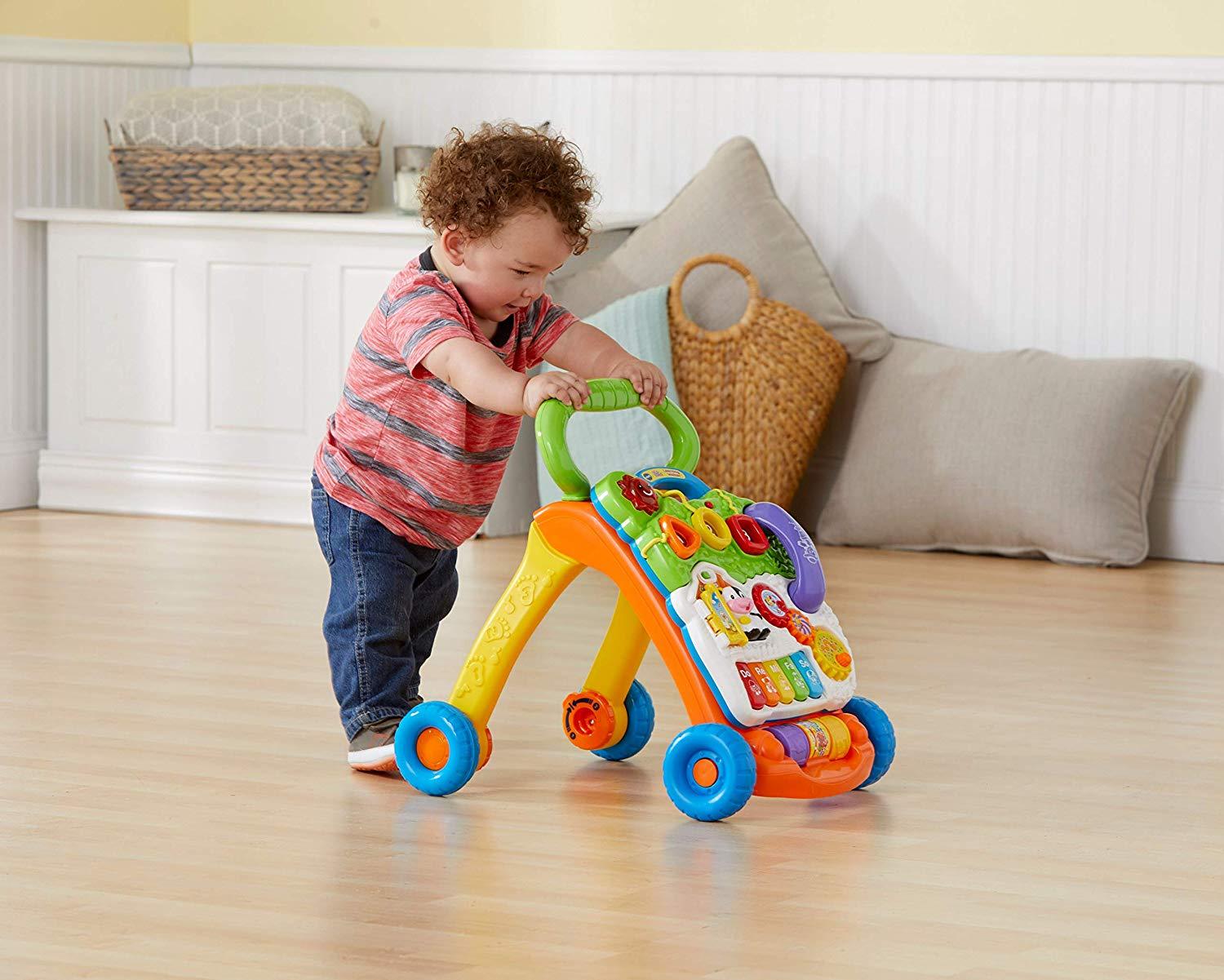 坐立两用。坐着的时候有很多玩耍的功能,站起来推着还可以学习走路。