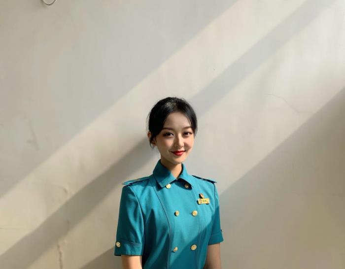 蓝色的空乘学员装扮,站在校园内红墙前面非常的具有画面感,确实看过一眼还想要看。