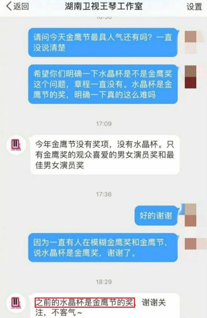 早前金鹰节上除了有“金杯”之外还有着水晶杯,不过今年金鹰节却不再设有水晶杯了。10月11日,金鹰节颁奖晚会总导演王琴就对大众所关心的水晶杯问题给大家释疑,称今年不再设有水晶杯,而且还再次强调了水晶杯其实只是金鹰节所设立的奖项并不是金鹰奖。而所谓的金鹰节所设立的奖项其实就是指湖南卫视自己所设立的奖项,这个奖与金鹰奖没有一点关系,而金鹰奖的前身其实是《大众电视》金鹰奖,也是国家级的唯一以观众投票为主评选产生的电视艺术大奖,其含金量自然更加重一些。