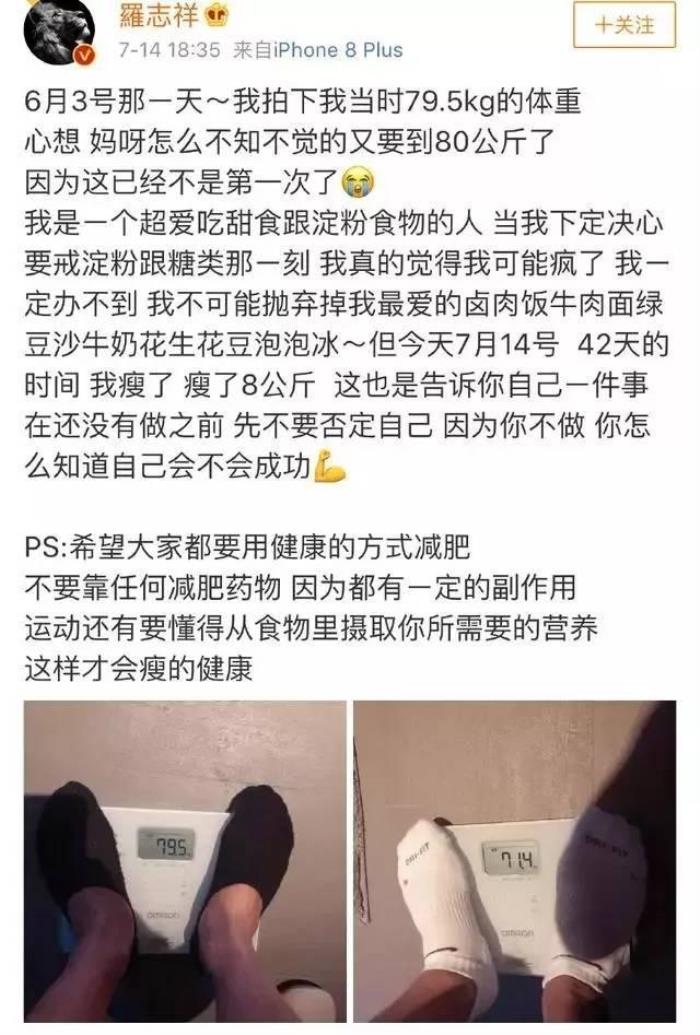 因为他是易胖体质,又爱吃甜食,所以总是忽胖忽瘦,试过药物减肥、节食减肥……亲身感受了它的副作用,所以呼吁粉丝们要懂得从食物中摄取你所需的营养,再配合适量运动。他自己就通过戒糖戒淀粉42天,成功瘦身了16斤。