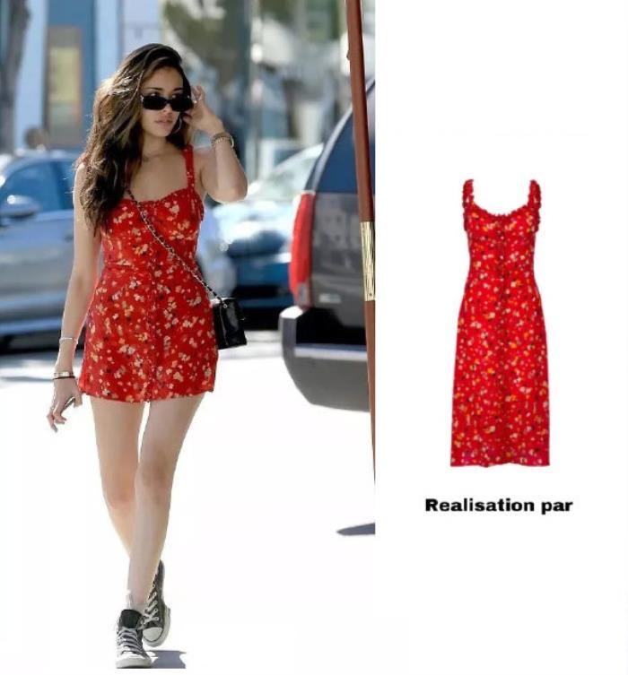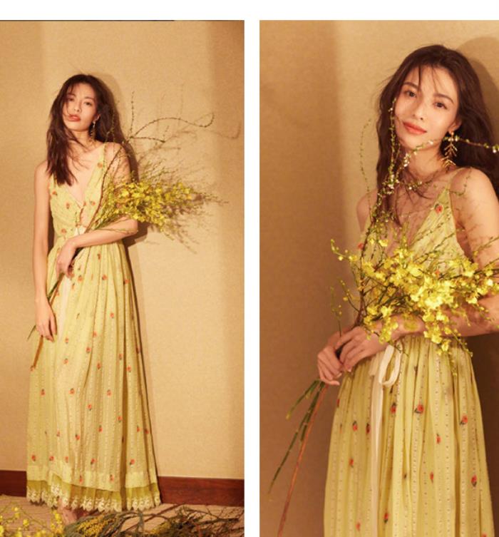方领吊带裙的特点是与胸部齐,整体上形成一个方形的形状,着重突出女性的胸部,但是这种连衣裙存在一个缺点,针对贫胸的妹纸可能不太适合这样方领或者说V领的连衣裙,如果非要尝试这样的裙子,那么我建议一定要选择像钟楚曦这件一样有荷花边设计的方领,从而使衣领更加具有层次感,而不会看上去那么平坦。