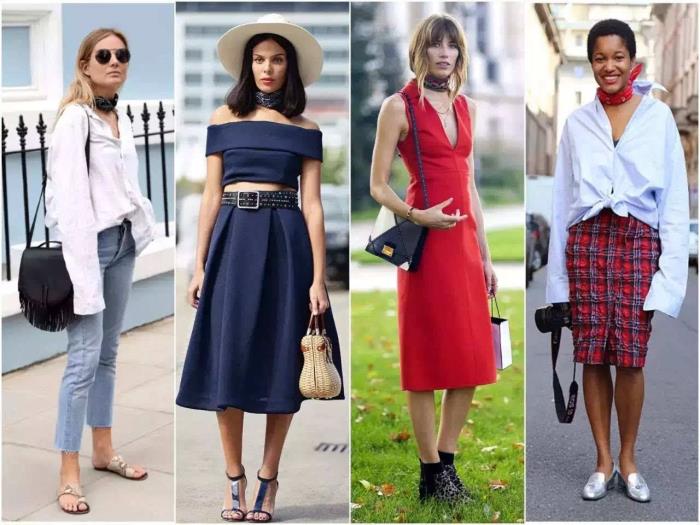 方巾最常规的搭配方式就是作为颈部装饰,起到修饰颈部线条的作用。当然,它的系法也是多种多样的,比如简洁干练的一字巾、浪漫的法式结,异域风情的阿富汗结以及专属于连衣裙的后颈部结。嫌麻烦的小仙女们也可以尝试最简单的结,类似于红领巾的系法,最后只需将三角的部分转到前面即可。