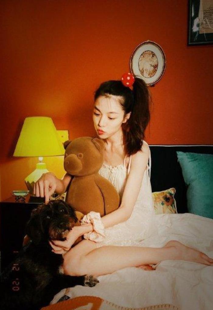 钟楚曦跪坐在白色的床垫上,白皙的皮肤在白色连衣裙的衬托下显得更加的白皙,一边抱着心爱的布偶熊一边嘟着嘴巴调皮地逗狗的钟楚曦也是十分的俏皮可爱呢~狗狗似乎也有点不好意思看着眼前的这位美丽动人小姐姐,害羞地将头转向了我们的镜头呢~