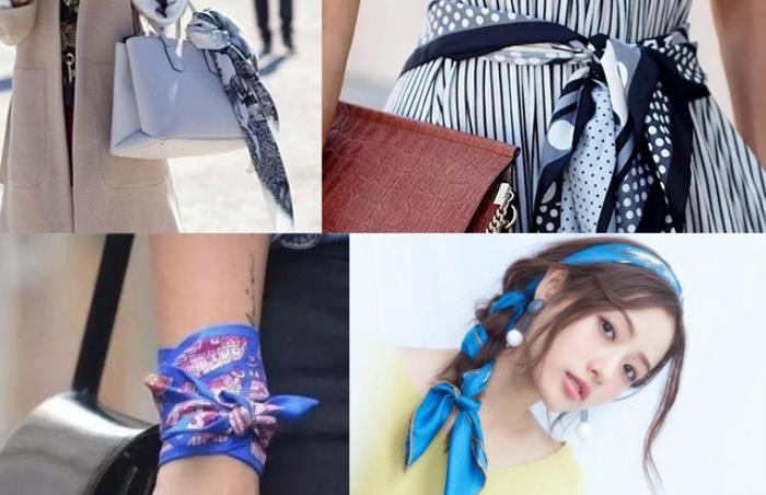 方巾除了可以作为颈部修饰品之外,还可以作为头巾、包包的装饰品、手颈的装饰、腰部的装饰等等,方巾作为头饰同样也有各种各样的系法,比如元气的马尾和半丸子头的系法,温柔气质型的麻花辫系法,还有类似于马来西亚女人的头饰,将头全部裹住的方法。有兴趣的小伙伴可以私底下尝试多种系法。