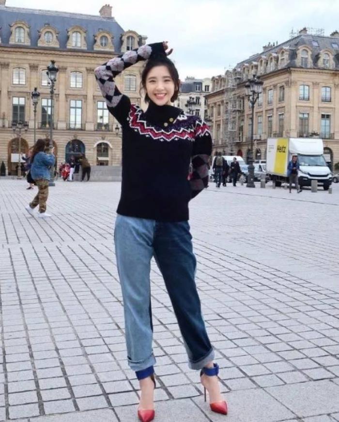唐艺昕用黑色拼接毛衣搭配牛仔裤时髦又好看!