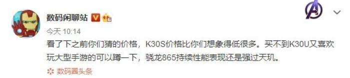 此外消息称,另一款将发布的新机Remdi K30S就是小米10T系列国行版,由于小米10T系列已经在海外发布过,所以我们已经可以知晓这款手机的外观配置信息。但值得一提的是,据一位数码博主爆料,Redmi K30S的售价可能会比大家“想象的低很多”。