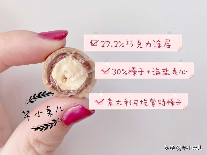 口感是很实在的牛奶香,甜度是在你刚刚好觉得会腻之前,被海盐夹心和很大颗的榛子粒就中和了,平衡感做的很好,个人觉得是非常安全的一个口味,送妹子讨巧,送男生又不会觉得太女里女气(什么词!)~
