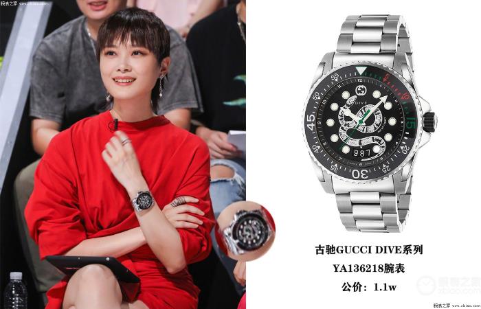 这款GUCCI DIVE系列是很典型的时装表,白色表面饰以金色猫科动物头像图案,金黄色表后盖也镌刻有猫头图案,调性统一。李宇春选择了白衣白帽进行搭配,整体和谐自然。