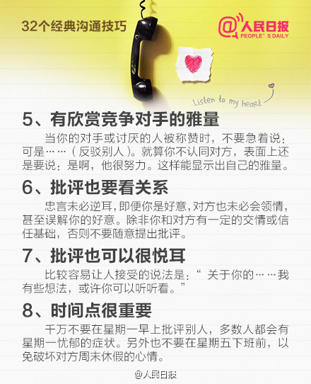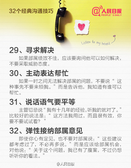 早安 【32个经典沟通技巧,让你在人际相处中如鱼得水】会赞美、会拒绝,无论说什么都恰到好处;即便是批评也让人乐意听……高超的沟通,你也可以做到!①赞美行为而非个人;②透过第三者表达赞美;③批评的同时要提出建议;④微笑避开私人问题;⑤让对方觉得他重要…戳图帮你迅速拥有亲和力!