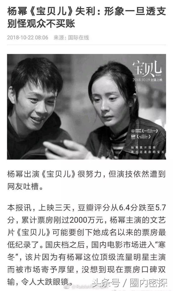 无论是哪个,面对《宝贝儿》前后电影节颗粒无收,上映后票房口碑崩坏的局面,杨幂本人都可能觉得委屈,自己这么久的努力与付出,全部打了水漂。