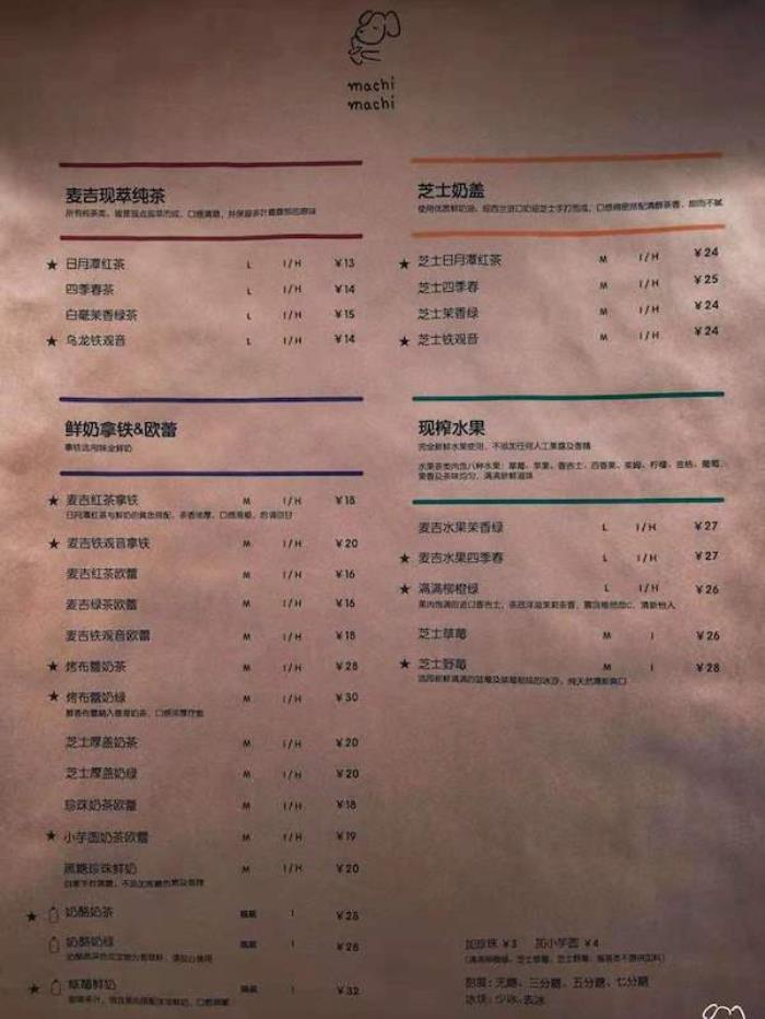 从菜单上可以看到,麦吉machimachi的茶饮价格并不算贵到离谱,最便宜的纯茶饮品单价在13元一杯,而最贵的草莓鲜奶则售价32元一杯,如今广受欢迎的水果茶系列的售价则在26-28元之间,基本和上海市场上的茶饮店售价持平。