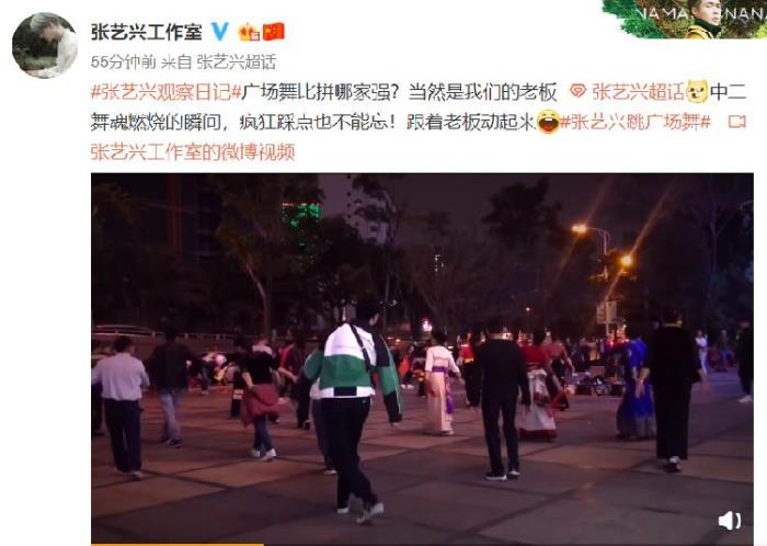 10月22日,张艺兴工作室在社交平台分享了一段张艺兴跳广场舞的视频,并配文:“广场舞比拼哪家强?当然是我们的老板中二舞魂燃烧的瞬间,疯狂踩点也不能忘!跟着老板动起来~”。