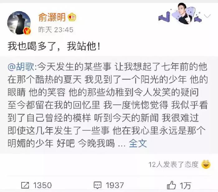 在胡歌发文之后,瞬间就上了热搜,于是俞灏明也马上发文了,可是要感慨就感慨嘛,这一句“我也喝多了,我站他!”敷衍又浮夸,还有三观以及情商都感人,这是在公开支持蒋劲夫家暴?