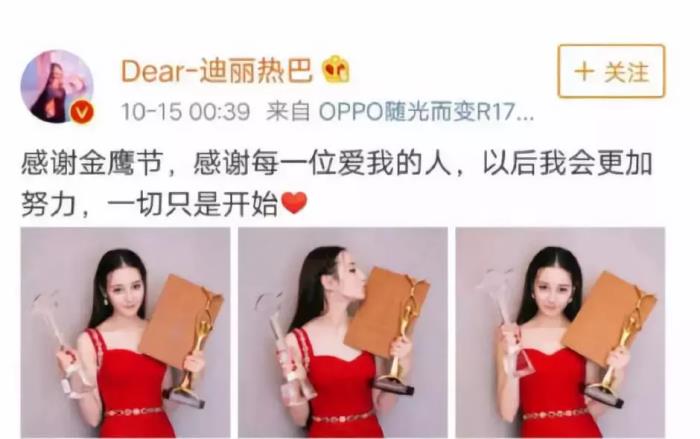迪丽热巴以不知名的神秘力量顶着一部莫名其妙的剧,打败杨紫和一众实力派演员拿下金鹰节影后,被嘲这是史上注水最严重的奖。