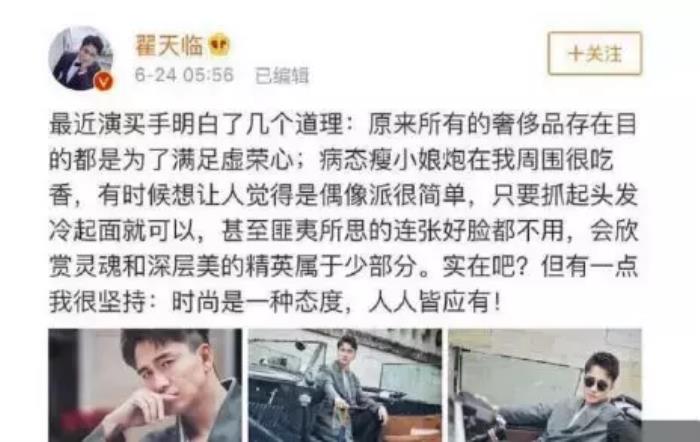 翟天临是痛批年轻小鲜肉,点名这是病态瘦小娘炮,最后放上自己耍帅的照片。