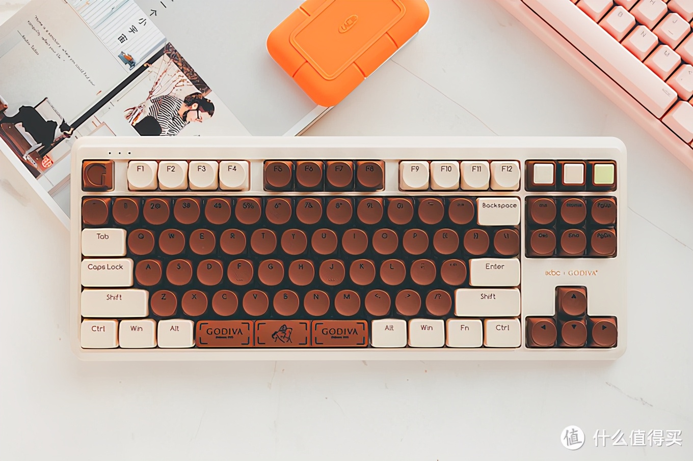 这一款键盘为87按键,少了小键盘区域,但是在键帽的设计上,还是下了不少心思,比如大部分键帽都是常见的深棕色巧克力色,部分按键则是采用了白巧克力的配色,右上角的功能按键做了糖果配色。