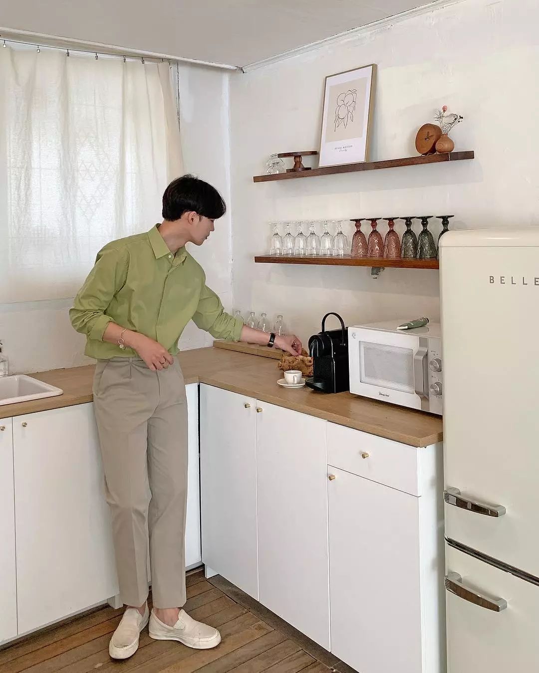 饱和度比较低的绿色也是夏天不错的选择,绿色也是今年比较流行的颜色,衬衫搭配西装裤,很有型。看到这里你应该也发现了,小哥哥整套look的颜色会控制在三色以内,这是男生穿衣服时的一个重要原则,颜色不要太多哦!