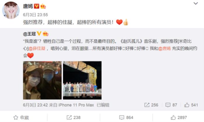 6月3日深夜,主持人王冠分享了两张和唐嫣一起去看好闺蜜薛佳凝音乐剧《赵氏孤儿》的合影,写道:“我是谁?牺牲自己是一个过程,而不是最终目的。《赵氏孤儿》音乐剧,强烈推荐! 唱到心里,泪在眼里,所有演员都好棒! 我和唐嫣充实的晚间约会”,还分别艾特了薛佳凝和唐嫣。不久后,唐嫣转发并配文打call:“强烈推荐,超棒的佳凝,超棒的所有演员!”看得出三人的交情相当不错。