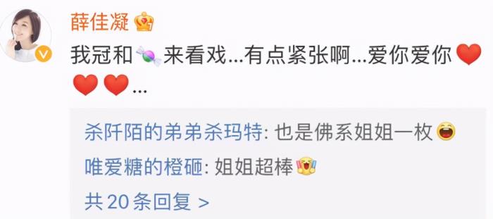 看看她给王冠写的评论就知道啦:“我冠和糖来看戏,有点紧张啊,爱你爱你”,还附上了三颗心的表情,三人的神仙友情着实令人羡慕。