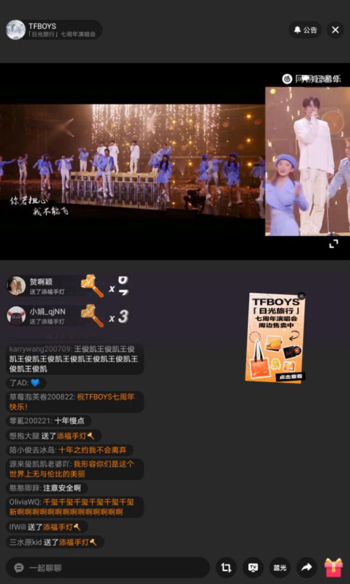 据了解,此次演唱会是TFBOYS组合出道七年以来的首次全线上演唱会,其制作、互动、宣发、周边衍生品开发等全流程由网易云音乐全面主导策划并参与。在观看体验上,网易云音乐采用了实时互动+高清晰度画质直播的线上演唱会形态,如直拍机位观看(即单人机位,支持切换观看TFBOYS单个成员表演时的状态)、录播+直播等。