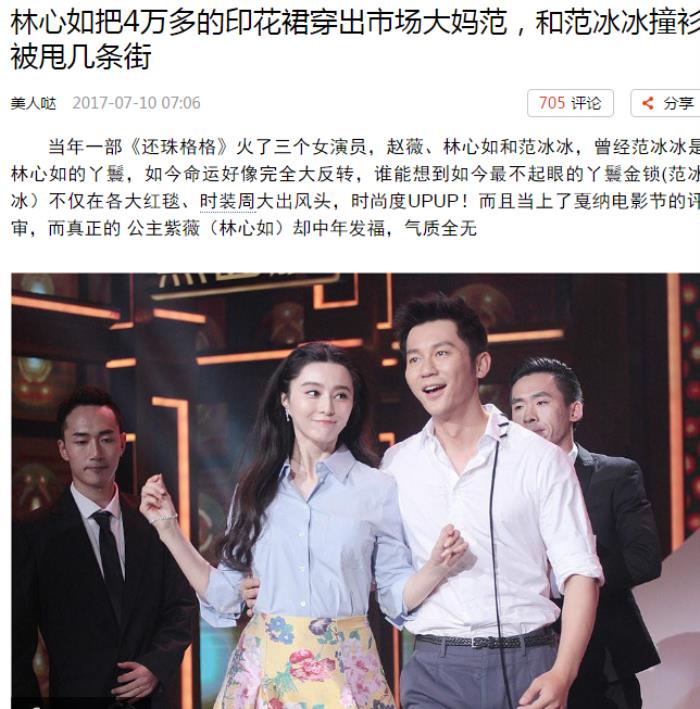 本来林心如看起来和范冰冰一样年轻漂亮,撞衫印花裙,看起来都很漂亮少女,但偏偏舆论导向却说林心如完败,把几万块的花裙子穿出了大妈范,林心如看到估计要气死,范冰冰也不愧是女星撞衫克星,只要和她撞衫都要被秒杀。