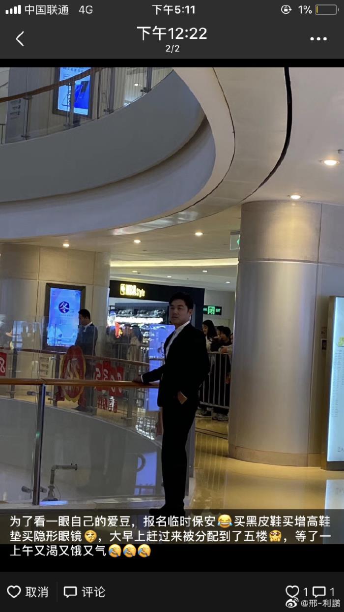 以下这位男粉更是为了见偶像拼了!兴高采烈的应聘了活动的安保本以为可以近距离见偶像一面,结果却被乌龙的分到了商场的五楼hhhh,所谓我离偶像最远的距离可能就是你在一楼而我在五楼哈哈哈哈,扇贝男孩真是辛苦您了