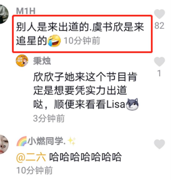 对此,网友纷纷评论道“虞书欣应该是追星追得最成功的一个吧?”“因为只有欣欣子对Lisa说了买米当卡叭”“我的欣欣宝贝太可爱了”“虞书欣:四舍五入我和Lisa一起睡觉了”“爬过去可还行”“别人是来出道的,虞书欣是来追星的”。