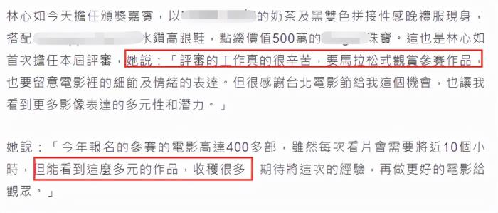 评审工作艰巨又辛苦,林心如感谢台北电影节给她这次机会,能够从更多影片中汲取能量。