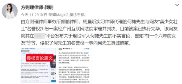 而在10月9日,律师颜聃也发布了动态,声称自己受理了何捷委托的网络侵权案件,一位名叫“美少女壮士”的网友在网上发帖,捏造了何捷抛弃了相恋6年的女友,因为贪图名利才与张馨予结合的事实,还称何捷的家人反对他与张馨予结婚,何捷最终将此网友依法上诉,最终判决该网友涉嫌侵犯何捷的名誉权,勒令其就此事向何捷公开发文致歉。