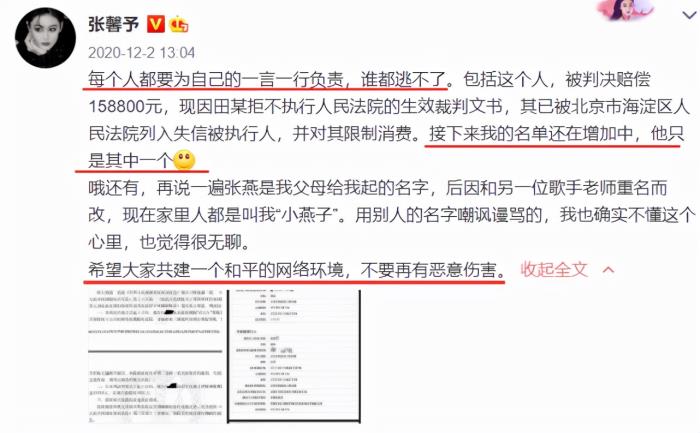另外,张馨予对诋毁者的态度始终很强硬,她不止一次称每个人都要对自己的一言一行负责,谁都逃不了,希望共建和平的网络环境,不要再恶意伤害。