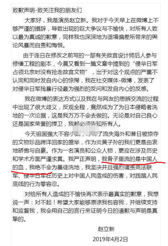 提及当年的侵华显然是很敏感的话题,但是他说得对还好,可他明显就是有些“亲日”,随后他就被紫光阁、共青团中央、中国反邪教齐齐点名,称“对本国以往历史,应该略有所知”。 3日凌晨,赵立新也知道事态发展严重,先是删掉原先的言论,随即发布长篇声明表达歉意。